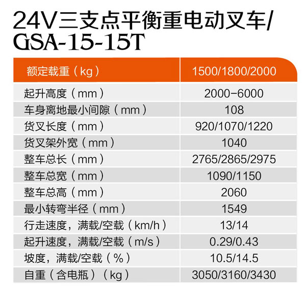 24V三支點(diǎn)平衡重電動(dòng)叉車(chē)GSA-15-15T